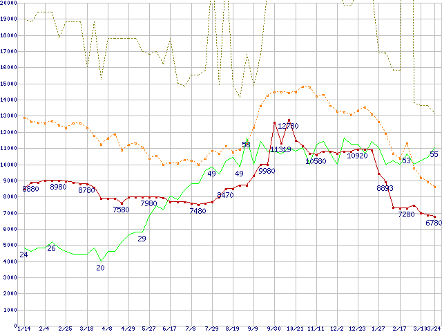 ※このグラフは過去のデータも税率5%相当に調整した税込み相当額のグラフです。 税率変更や、総額表示方式導入(2004年4月)の影響は除いています。 | | | ●凡例 | 最安値 (点線部は販売店未確認 または未調査) | 平均値 | 最高値 | ショップ数 |