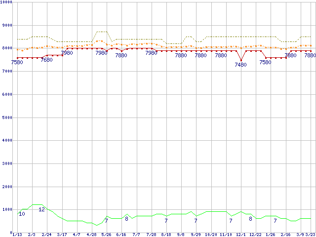 ※このグラフは過去のデータも税率5%相当に調整した税込み相当額のグラフです。 税率変更や、総額表示方式導入(2004年4月)の影響は除いています。 | | | ●凡例 | 最安値 (点線部は販売店未確認 または未調査) | 平均値 | 最高値 | ショップ数 |