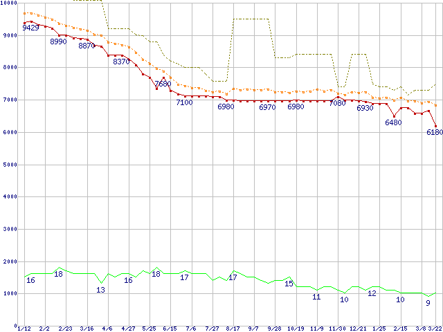※このグラフは過去のデータも税率5%相当に調整した税込み相当額のグラフです。 税率変更や、総額表示方式導入(2004年4月)の影響は除いています。 | | | ●凡例 | 最安値 (点線部は販売店未確認 または未調査) | 平均値 | 最高値 | ショップ数 |