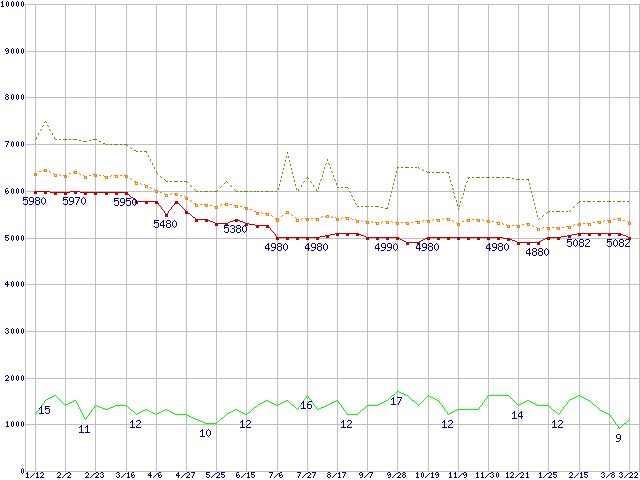 ※このグラフは過去のデータも税率5%相当に調整した税込み相当額のグラフです。 税率変更や、総額表示方式導入(2004年4月)の影響は除いています。 | | | ●凡例 | 最安値 (点線部は販売店未確認 または未調査) | 平均値 | 最高値 | ショップ数 |