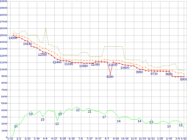 ※このグラフは過去のデータも税率5%相当に調整した税込み相当額のグラフです。 税率変更や、総額表示方式導入(2004年4月)の影響は除いています。 | | | ●凡例 | 最安値 (点線部は販売店未確認 または未調査) | 平均値 | 最高値 | ショップ数 |