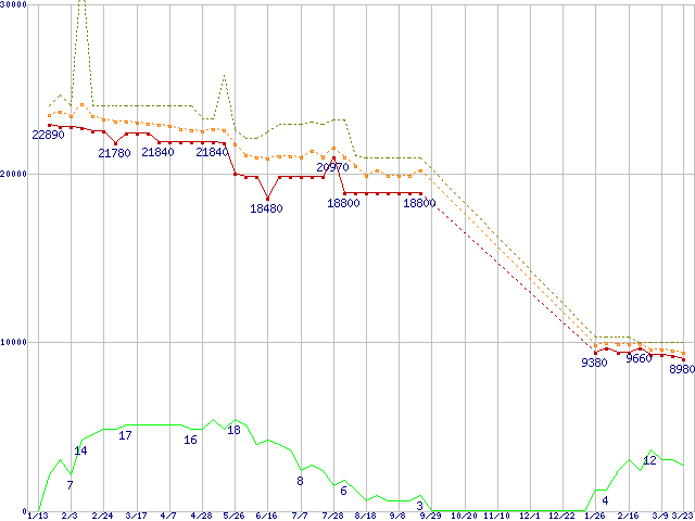 ※このグラフは過去のデータも税率5%相当に調整した税込み相当額のグラフです。 税率変更や、総額表示方式導入(2004年4月)の影響は除いています。 | | | ●凡例 | 最安値 (点線部は販売店未確認 または未調査) | 平均値 | 最高値 | ショップ数 |