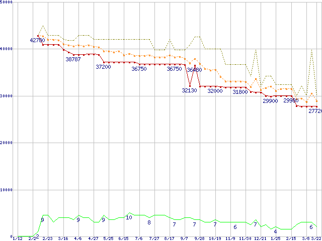 ※このグラフは過去のデータも税率5%相当に調整した税込み相当額のグラフです。 税率変更や、総額表示方式導入(2004年4月)の影響は除いています。 | | | ●凡例 | 最安値 (点線部は販売店未確認 または未調査) | 平均値 | 最高値 | ショップ数 |