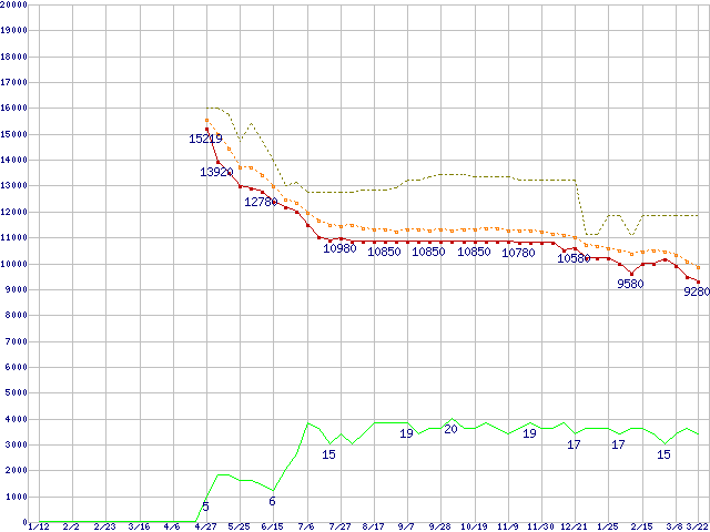 ※このグラフは過去のデータも税率5%相当に調整した税込み相当額のグラフです。 税率変更や、総額表示方式導入(2004年4月)の影響は除いています。 | | | ●凡例 | 最安値 (点線部は販売店未確認 または未調査) | 平均値 | 最高値 | ショップ数 |