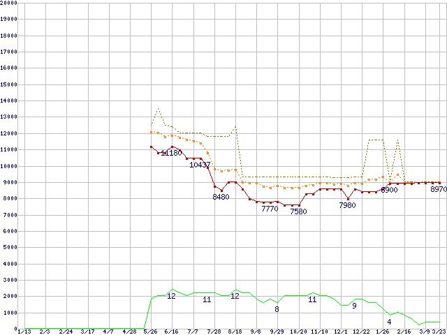 ※このグラフは過去のデータも税率5%相当に調整した税込み相当額のグラフです。 税率変更や、総額表示方式導入(2004年4月)の影響は除いています。 | | | ●凡例 | 最安値 (点線部は販売店未確認 または未調査) | 平均値 | 最高値 | ショップ数 |