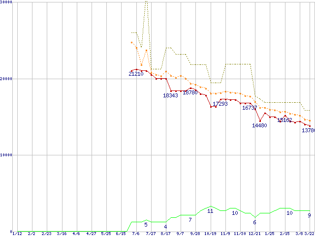 ※このグラフは過去のデータも税率5%相当に調整した税込み相当額のグラフです。 税率変更や、総額表示方式導入(2004年4月)の影響は除いています。 | | | ●凡例 | 最安値 (点線部は販売店未確認 または未調査) | 平均値 | 最高値 | ショップ数 |