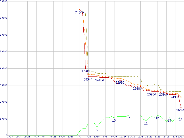 | Athlon 64 X2 4600+ (2.4GHz,L2 512KB×2,TDP65W)の価格推移 | | | (2006年1月13日~2007年3月23日) |