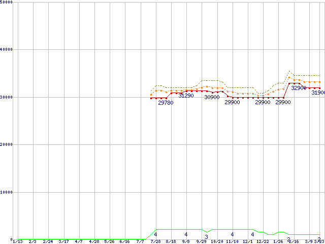※このグラフは過去のデータも税率5%相当に調整した税込み相当額のグラフです。 税率変更や、総額表示方式導入(2004年4月)の影響は除いています。 | | | ●凡例 | 最安値 (点線部は販売店未確認 または未調査) | 平均値 | 最高値 | ショップ数 |