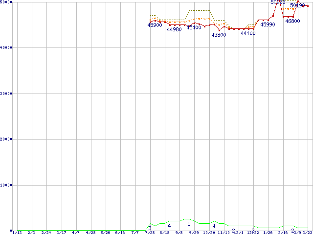 ※このグラフは過去のデータも税率5%相当に調整した税込み相当額のグラフです。 税率変更や、総額表示方式導入(2004年4月)の影響は除いています。 | | | ●凡例 | 最安値 (点線部は販売店未確認 または未調査) | 平均値 | 最高値 | ショップ数 |