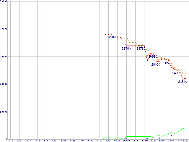 ※このグラフは過去のデータも税率5%相当に調整した税込み相当額のグラフです。 税率変更や、総額表示方式導入(2004年4月)の影響は除いています。 | | | ●凡例 | 最安値 (点線部は販売店未確認 または未調査) | 平均値 | 最高値 | ショップ数 |