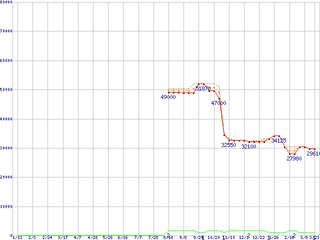 ※このグラフは過去のデータも税率5%相当に調整した税込み相当額のグラフです。 税率変更や、総額表示方式導入(2004年4月)の影響は除いています。 | | | ●凡例 | 最安値 (点線部は販売店未確認 または未調査) | 平均値 | 最高値 | ショップ数 |