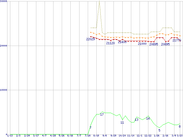 ※このグラフは過去のデータも税率5%相当に調整した税込み相当額のグラフです。 税率変更や、総額表示方式導入(2004年4月)の影響は除いています。 | | | ●凡例 | 最安値 (点線部は販売店未確認 または未調査) | 平均値 | 最高値 | ショップ数 |