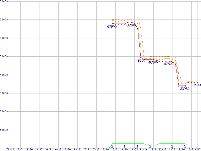 ※このグラフは過去のデータも税率5%相当に調整した税込み相当額のグラフです。 税率変更や、総額表示方式導入(2004年4月)の影響は除いています。 | | | ●凡例 | 最安値 (点線部は販売店未確認 または未調査) | 平均値 | 最高値 | ショップ数 |