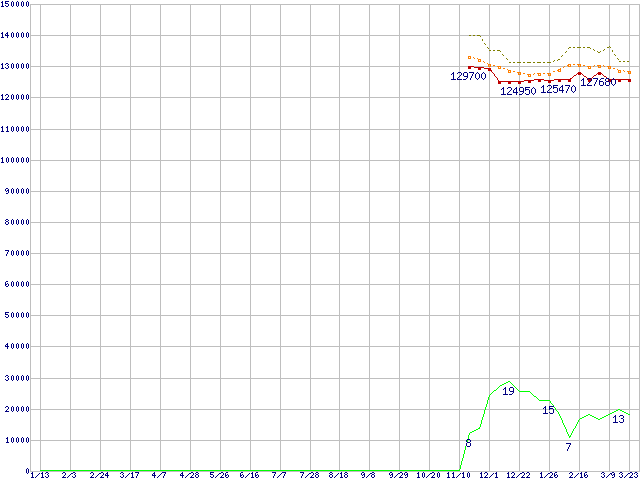 ※このグラフは過去のデータも税率5%相当に調整した税込み相当額のグラフです。 税率変更や、総額表示方式導入(2004年4月)の影響は除いています。 | | | ●凡例 | 最安値 (点線部は販売店未確認 または未調査) | 平均値 | 最高値 | ショップ数 |