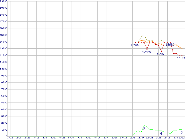 ※このグラフは過去のデータも税率5%相当に調整した税込み相当額のグラフです。 税率変更や、総額表示方式導入(2004年4月)の影響は除いています。 | | | ●凡例 | 最安値 (点線部は販売店未確認 または未調査) | 平均値 | 最高値 | ショップ数 |