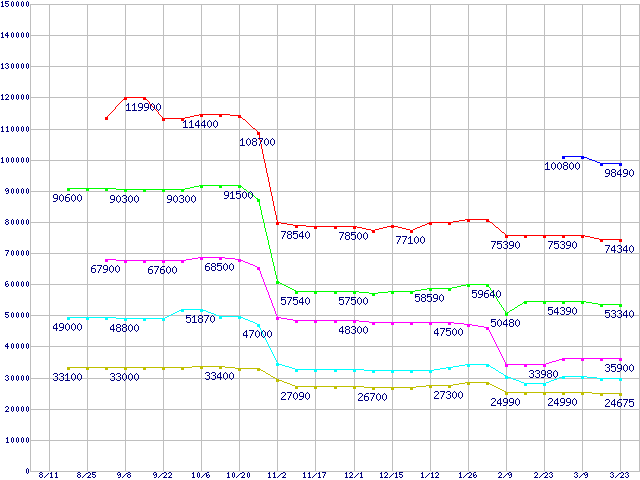 | Socket F (FSB 1000MHz,L2 1MBx2,Dual Core,TDP 95W)の最安値推移 | | | (2006年8月11日~2007年3月23日) |