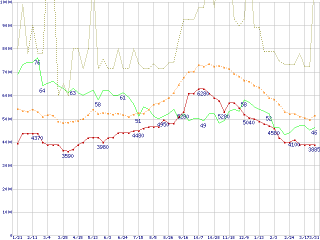 ※このグラフは過去のデータも税率5%相当に調整した税込み相当額のグラフです。 税率変更や、総額表示方式導入(2004年4月)の影響は除いています。 | | | ●凡例 | 最安値 (点線部は販売店未確認 または未調査) | 平均値 | 最高値 | ショップ数 |
