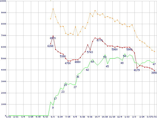 ※このグラフは過去のデータも税率5%相当に調整した税込み相当額のグラフです。 税率変更や、総額表示方式導入(2004年4月)の影響は除いています。 | | | ●凡例 | 最安値 (点線部は販売店未確認 または未調査) | 平均値 | 最高値 | ショップ数 |