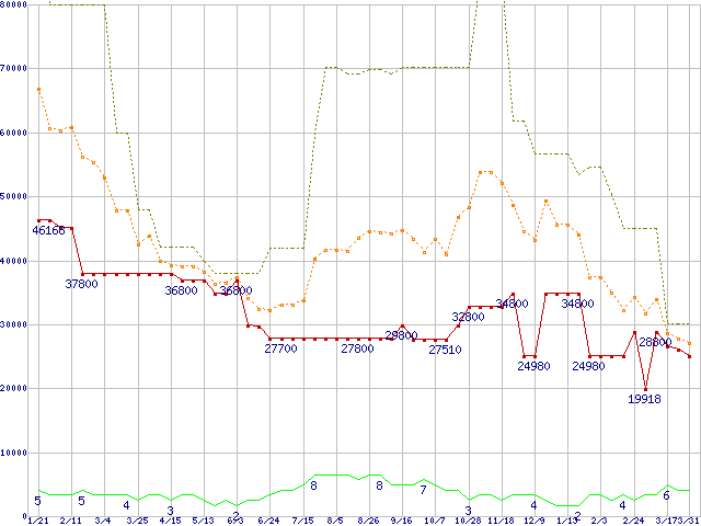 ※このグラフは過去のデータも税率5%相当に調整した税込み相当額のグラフです。 税率変更や、総額表示方式導入(2004年4月)の影響は除いています。 | | | ●凡例 | 最安値 (点線部は販売店未確認 または未調査) | 平均値 | 最高値 | ショップ数 |