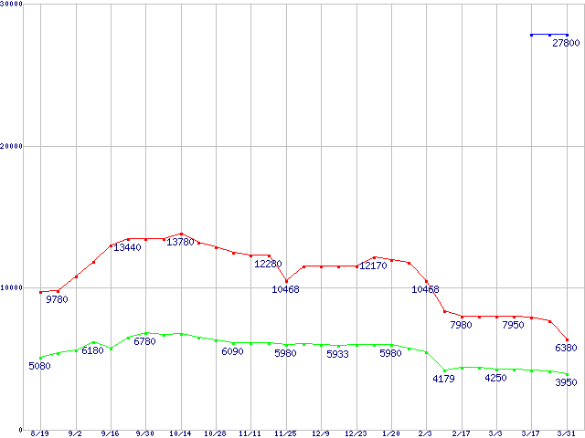 PC3200(DDR400) DDR SDRAM DIMMの最安値推移