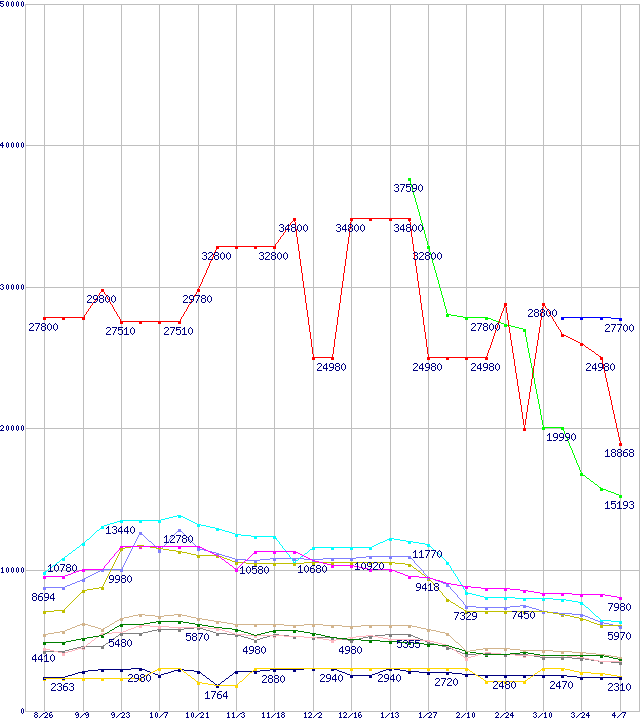 PC2-4200*(DDR2-533) DDR2 SDRAM DIMMの最安値推移