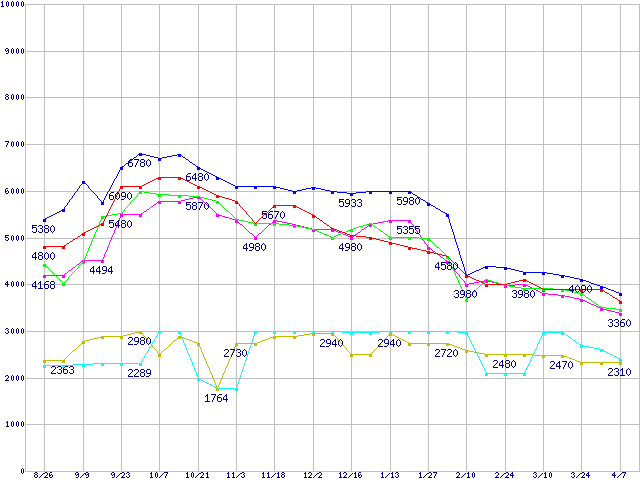 メモリ主要製品(最安値5千円未満)の最安値推移