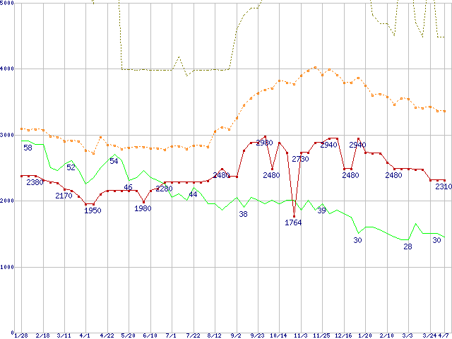※このグラフは過去のデータも税率5%相当に調整した税込み相当額のグラフです。 税率変更や、総額表示方式導入(2004年4月)の影響は除いています。 | | | ●凡例 | 最安値 (点線部は販売店未確認 または未調査) | 平均値 | 最高値 | ショップ数 |