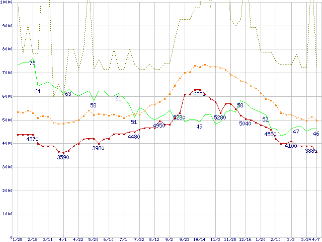 ※このグラフは過去のデータも税率5%相当に調整した税込み相当額のグラフです。 税率変更や、総額表示方式導入(2004年4月)の影響は除いています。 | | | ●凡例 | 最安値 (点線部は販売店未確認 または未調査) | 平均値 | 最高値 | ショップ数 |