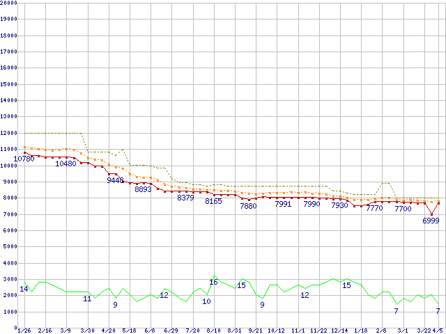 ※このグラフは過去のデータも税率5%相当に調整した税込み相当額のグラフです。 税率変更や、総額表示方式導入(2004年4月)の影響は除いています。 | | | ●凡例 | 最安値 (点線部は販売店未確認 または未調査) | 平均値 | 最高値 | ショップ数 |