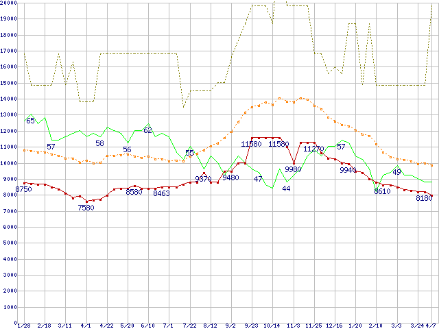 ※このグラフは過去のデータも税率5%相当に調整した税込み相当額のグラフです。 税率変更や、総額表示方式導入(2004年4月)の影響は除いています。 | | | ●凡例 | 最安値 (点線部は販売店未確認 または未調査) | 平均値 | 最高値 | ショップ数 |