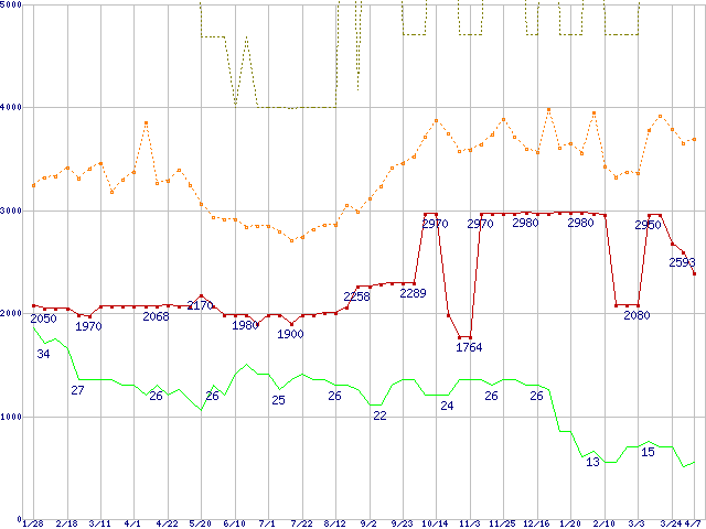 ※このグラフは過去のデータも税率5%相当に調整した税込み相当額のグラフです。 税率変更や、総額表示方式導入(2004年4月)の影響は除いています。 | | | ●凡例 | 最安値 (点線部は販売店未確認 または未調査) | 平均値 | 最高値 | ショップ数 |