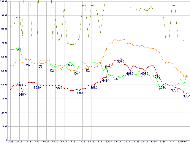 ※このグラフは過去のデータも税率5%相当に調整した税込み相当額のグラフです。 税率変更や、総額表示方式導入(2004年4月)の影響は除いています。 | | | ●凡例 | 最安値 (点線部は販売店未確認 または未調査) | 平均値 | 最高値 | ショップ数 |