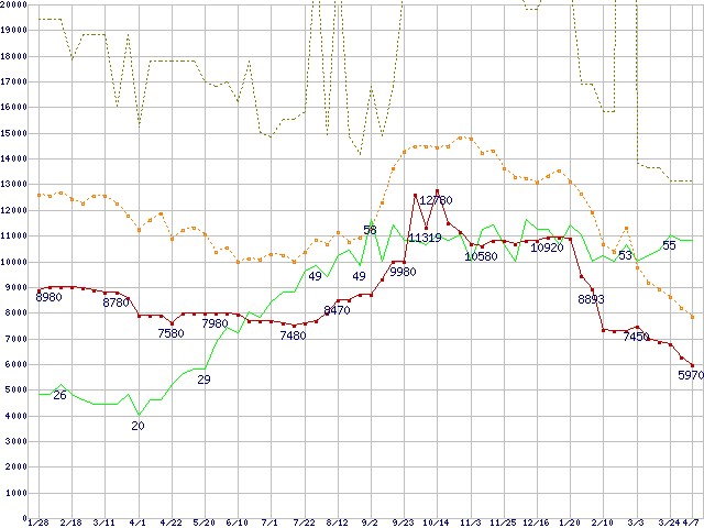 ※このグラフは過去のデータも税率5%相当に調整した税込み相当額のグラフです。 税率変更や、総額表示方式導入(2004年4月)の影響は除いています。 | | | ●凡例 | 最安値 (点線部は販売店未確認 または未調査) | 平均値 | 最高値 | ショップ数 |