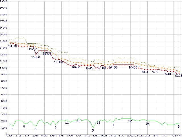※このグラフは過去のデータも税率5%相当に調整した税込み相当額のグラフです。 税率変更や、総額表示方式導入(2004年4月)の影響は除いています。 | | | ●凡例 | 最安値 (点線部は販売店未確認 または未調査) | 平均値 | 最高値 | ショップ数 |
