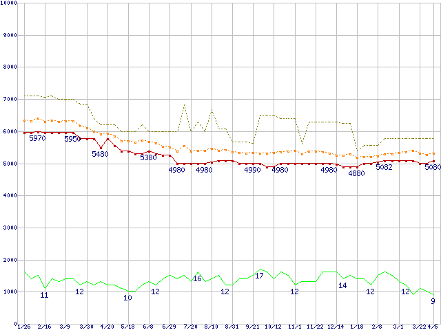 ※このグラフは過去のデータも税率5%相当に調整した税込み相当額のグラフです。 税率変更や、総額表示方式導入(2004年4月)の影響は除いています。 | | | ●凡例 | 最安値 (点線部は販売店未確認 または未調査) | 平均値 | 最高値 | ショップ数 |