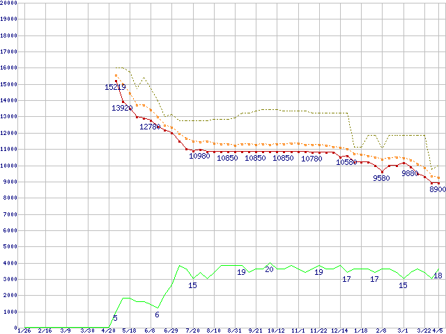 ※このグラフは過去のデータも税率5%相当に調整した税込み相当額のグラフです。 税率変更や、総額表示方式導入(2004年4月)の影響は除いています。 | | | ●凡例 | 最安値 (点線部は販売店未確認 または未調査) | 平均値 | 最高値 | ショップ数 |