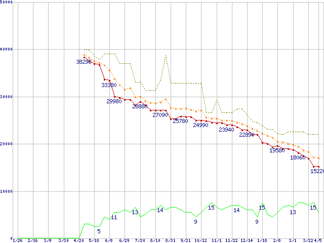 ※このグラフは過去のデータも税率5%相当に調整した税込み相当額のグラフです。 税率変更や、総額表示方式導入(2004年4月)の影響は除いています。 | | | ●凡例 | 最安値 (点線部は販売店未確認 または未調査) | 平均値 | 最高値 | ショップ数 |