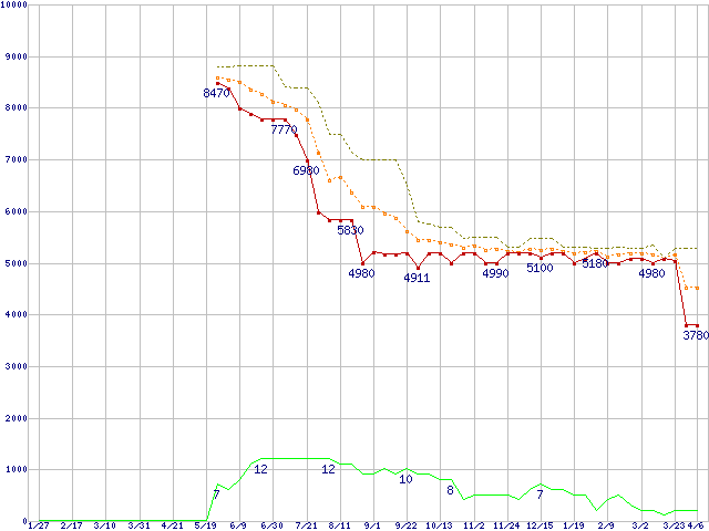※このグラフは過去のデータも税率5%相当に調整した税込み相当額のグラフです。 税率変更や、総額表示方式導入(2004年4月)の影響は除いています。 | | | ●凡例 | 最安値 (点線部は販売店未確認 または未調査) | 平均値 | 最高値 | ショップ数 |