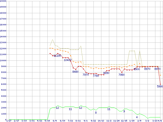 ※このグラフは過去のデータも税率5%相当に調整した税込み相当額のグラフです。 税率変更や、総額表示方式導入(2004年4月)の影響は除いています。 | | | ●凡例 | 最安値 (点線部は販売店未確認 または未調査) | 平均値 | 最高値 | ショップ数 |