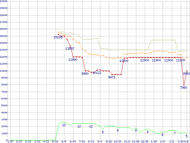 ※このグラフは過去のデータも税率5%相当に調整した税込み相当額のグラフです。 税率変更や、総額表示方式導入(2004年4月)の影響は除いています。 | | | ●凡例 | 最安値 (点線部は販売店未確認 または未調査) | 平均値 | 最高値 | ショップ数 |
