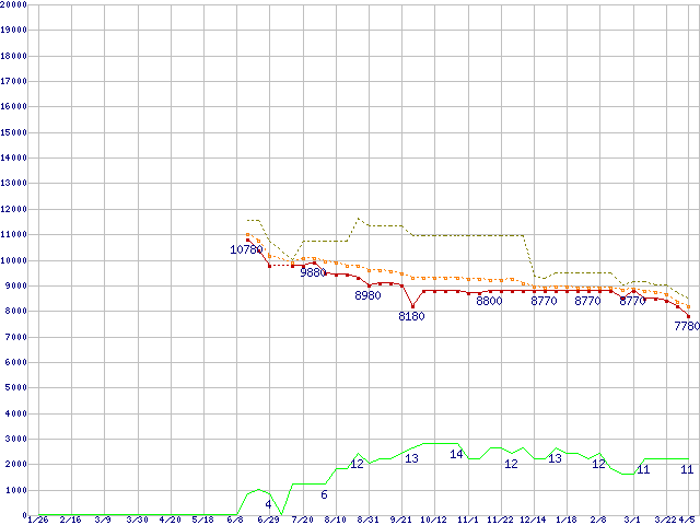 ※このグラフは過去のデータも税率5%相当に調整した税込み相当額のグラフです。 税率変更や、総額表示方式導入(2004年4月)の影響は除いています。 | | | ●凡例 | 最安値 (点線部は販売店未確認 または未調査) | 平均値 | 最高値 | ショップ数 |