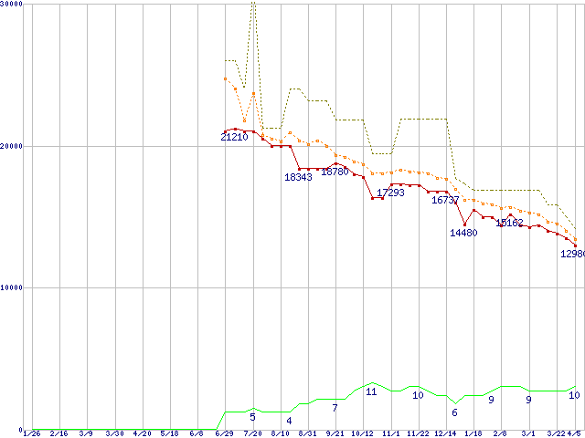 ※このグラフは過去のデータも税率5%相当に調整した税込み相当額のグラフです。 税率変更や、総額表示方式導入(2004年4月)の影響は除いています。 | | | ●凡例 | 最安値 (点線部は販売店未確認 または未調査) | 平均値 | 最高値 | ショップ数 |
