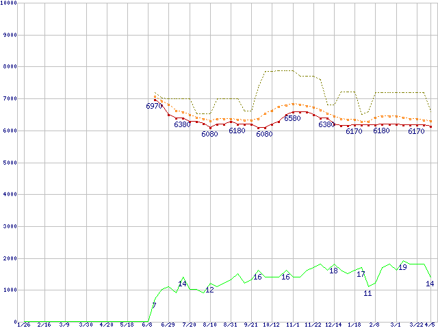 ※このグラフは過去のデータも税率5%相当に調整した税込み相当額のグラフです。 税率変更や、総額表示方式導入(2004年4月)の影響は除いています。 | | | ●凡例 | 最安値 (点線部は販売店未確認 または未調査) | 平均値 | 最高値 | ショップ数 |