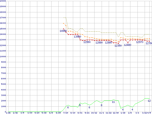 ※このグラフは過去のデータも税率5%相当に調整した税込み相当額のグラフです。 税率変更や、総額表示方式導入(2004年4月)の影響は除いています。 | | | ●凡例 | 最安値 (点線部は販売店未確認 または未調査) | 平均値 | 最高値 | ショップ数 |