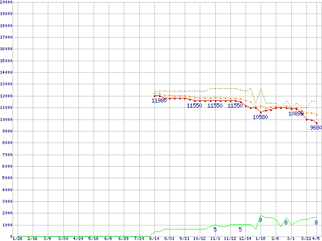 ※このグラフは過去のデータも税率5%相当に調整した税込み相当額のグラフです。 税率変更や、総額表示方式導入(2004年4月)の影響は除いています。 | | | ●凡例 | 最安値 (点線部は販売店未確認 または未調査) | 平均値 | 最高値 | ショップ数 |