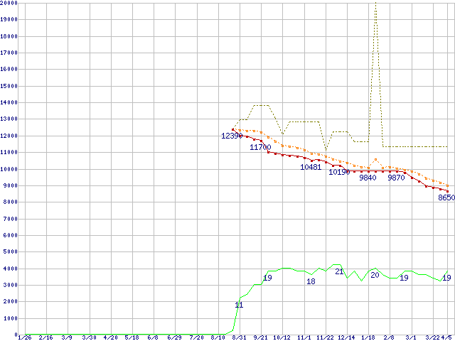 ※このグラフは過去のデータも税率5%相当に調整した税込み相当額のグラフです。 税率変更や、総額表示方式導入(2004年4月)の影響は除いています。 | | | ●凡例 | 最安値 (点線部は販売店未確認 または未調査) | 平均値 | 最高値 | ショップ数 |