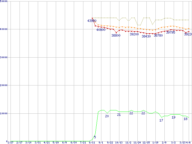 ※このグラフは過去のデータも税率5%相当に調整した税込み相当額のグラフです。 税率変更や、総額表示方式導入(2004年4月)の影響は除いています。 | | | ●凡例 | 最安値 (点線部は販売店未確認 または未調査) | 平均値 | 最高値 | ショップ数 |