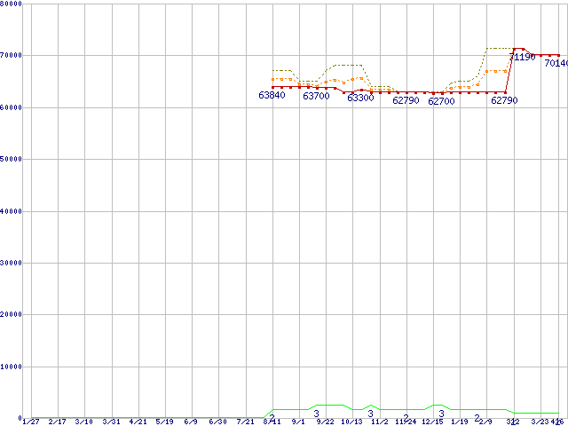 ※このグラフは過去のデータも税率5%相当に調整した税込み相当額のグラフです。 税率変更や、総額表示方式導入(2004年4月)の影響は除いています。 | | | ●凡例 | 最安値 (点線部は販売店未確認 または未調査) | 平均値 | 最高値 | ショップ数 |
