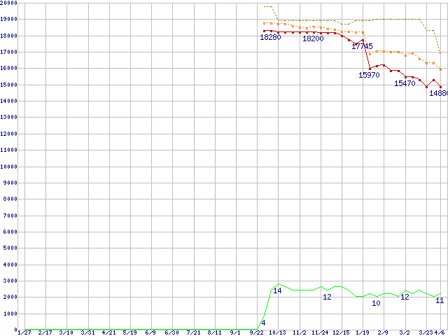 ※このグラフは過去のデータも税率5%相当に調整した税込み相当額のグラフです。 税率変更や、総額表示方式導入(2004年4月)の影響は除いています。 | | | ●凡例 | 最安値 (点線部は販売店未確認 または未調査) | 平均値 | 最高値 | ショップ数 |