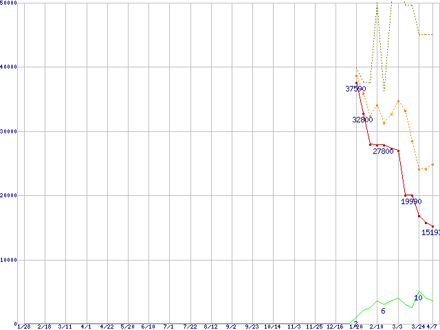 ※このグラフは過去のデータも税率5%相当に調整した税込み相当額のグラフです。 税率変更や、総額表示方式導入(2004年4月)の影響は除いています。 | | ●凡例 | 最安値 (点線部は販売店未確認 または未調査) | 平均値 | 最高値 | ショップ数 |